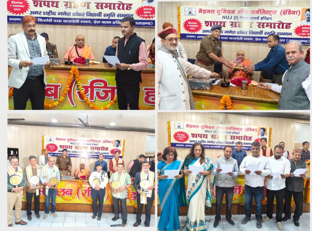 गौरतलब है कि देश में पत्रकारों की सबसे बड़ी संस्था एनयूजे (आई) उत्तराखंड, इकाई हरिद्वार की नवनिर्वाचित कार्यकारिणी का शपथ ग्रहण समारोह एवं अमर शहीद गणेश शंकर विद्यार्थी सम्मान समारोह का आयोजन प्रेस क्लब हरिद्वार के सभागार में आयोजित किया गया। कार्यक्रम के अध्यक्ष जगद्गुरु शंकराचार्य स्वामी राजराजेश्वराश्रम, मुख्य अतिथि जिलाधिकारी मयूर दीक्षित एवं विशिष्ट अतिथि वरिष्ठ पुलिस अधीक्षक प्रमेन्द्र डोभाल ने नवनिर्वाचित कार्यकारिणी सदस्यों अध्यक्ष- नरेश गुप्ता, उपाध्यक्ष-राधिका नागरथ, विकास कुमार झा,, महामंत्री- संदीप रावत, कोषाध्यक्ष-सचिन कुमार, वरिष्ठ सचिव-जोगेंद्र मावी सचिव- प्रतिभा वर्मा व सोमेश खत्री