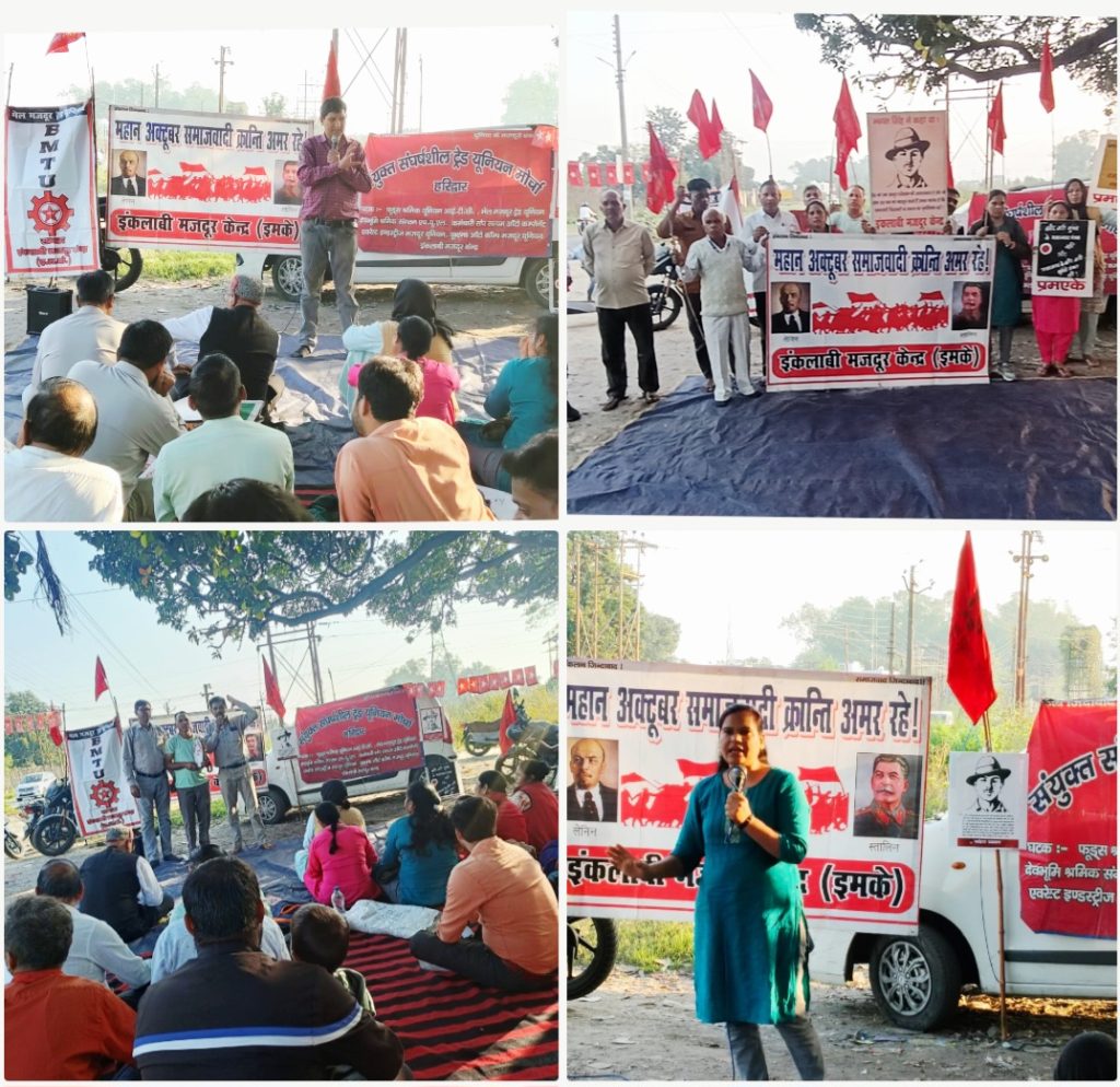 सिडकुल के विभिन्न चौराहों पर पर्चे के माध्यम से मजदूरों को महान अक्टूबर समाजवादी क्रांति की उपलब्धियों से अवगत कराया गया।