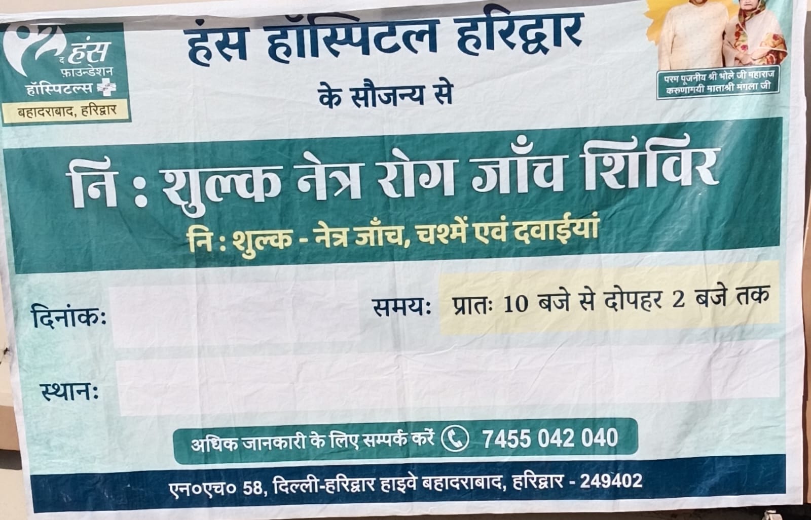 हरिद्वार,हंस हॉस्पिटल के सहयोग से दिनांक 1.10.2025 को मोहल्ला कड़च्छ ज्वालापुर निकट बड़ा रविदास मंदिर पर आंखों का निशुल्क कैंप लगेगा जिसमें चश्मा दवाई वितरण किए जाएंगे आप लोगों से अनुरोध है की अधिक से अधिक संख्या में पधारकर कैम्प का लाभ उठाए। सभी लाभार्थियो को अपने साथ आधार कार्ड और मोबाइल नंबर जरूर लाएं कैम्प सुबह 9:00 बजे से 2:00 बजे तक लगाया जाएगा।