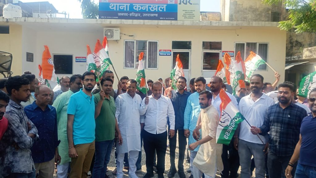 कांग्रेस कमेटी हरिद्वार द्वारा कनखल में लगातार बढ़ती आपराधिक घटनाएं लूट, हत्या, चैन स्नैचिंग के विरोध में कनखल थाना के बाहर भाजपा सरकार के विरोध में प्रदर्शन किया गया।