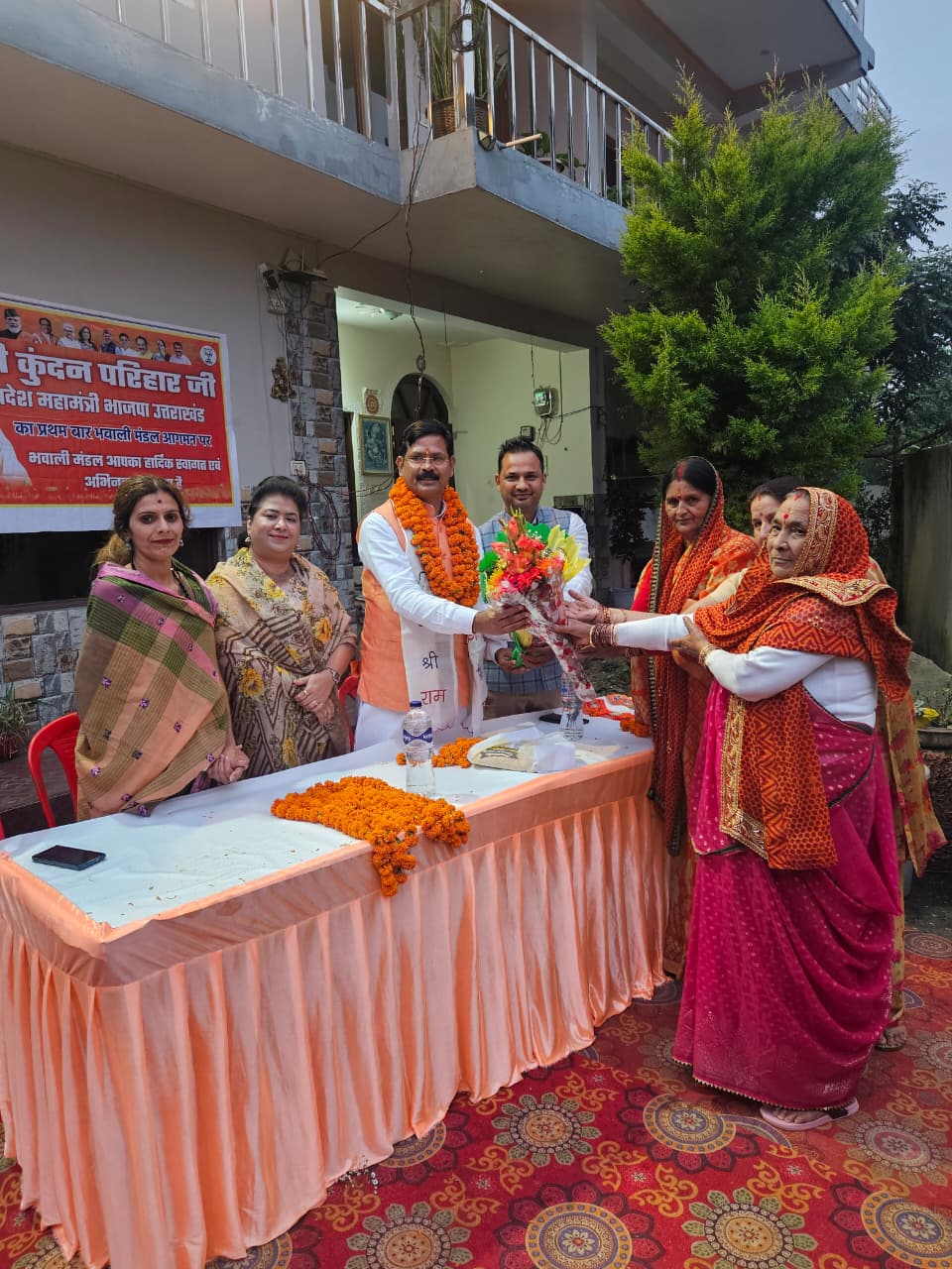 भवाली। भारतीय जनता पार्टी के प्रदेश महामंत्री कुंदन परिहार का पहली बार भवाली आगमन पर कार्यकर्ताओं ने उनका जोरदार स्वागत करते हुवे फूलमालाओं से सुसज्जित अंग वस्त्र भेंट कर उनका अभिनंदन किया अपने संबोधन में परिहार ने कहा कि भाजपा का असली बल कार्यकर्ता हैं उन्होंने कहा “कार्यकर्ता ही संगठन की शक्ति और आत्मा हैं” परिहार ने कार्यकर्ताओं से आह्वान किया कि सभी मिलकर पार्टी व प्रधामंत्री नरेंद्र मोदी के स्वदेशी अभियान की विचारधारा को जनता तक पहुँचाए कहा कि मुख्यमंत्री पुष्कर सिंह धामी के नेतृत्व वाली प्रदेश सरकार लगातार जनहित के निर्णय ले रही है जो विकास के लिए प्रतिबद्ध है कार्यक्रम में मण्डल अध्यक्ष हिमांशु बिष्ट महीला मोर्चा प्रदेश महामंत्री भावना मेहरा जिला उपाध्यक्ष प्रगति जैन ने भी संबोधित किया ने भी इस दौरान प्रकाश आर्या पूर्व पालिकाध्यक्ष संजय वर्मा शिवांशु जोशी कंचन साह प्रेम सिंह नेगी शुभम कुमार अमित पांडेय मोहित कुमार अंशुमान सिंह दफोती हिमांशु रावत आयुष कुमार कमला आर्या अंश चौधरी इशांत मेहरा कृष नेगी नीतु जोशी भगवती मेहरा धनी मेहरा लता शर्मा गीता पाठक कार्यक्रम का संचालन वर्षा आर्या ने किया।