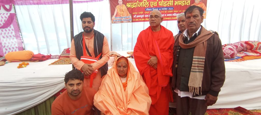 हरिद्वार मां अन्नपूर्णा धाम ट्रस्ट ठोकर नंबर 13 सप्त सरोवर रोड हरिद्वार में माता देवी कांता परमहंस शिष्या स्वामी अजरानन्द महाराज के ब्रह्मलीन हो जाने के पश्चात श्रद्धांजलि सभा एवं भंडारे का आयोजन भक्त जनों द्वारा किया गया इस अवसर पर बोलते हुए महंत दुर्गादास महाराज ने कहा संतों का जीवन समाज को समर्पित होता है और भक्तजनों का मार्गदर्शन कर गुरुदेव ईश्वर में विलीन हो जाते हैं उनकी स्मृतियां हमारे जीवन के लिए प्रेरणा स्रोत उद्देश्य होती इस अवसर पर महंत रवि देव महाराज महंत सूरज दास महाराज महंत दिनेश दास महाराज महंत जगजीत सिंह महाराज सहित भारी संख्या में संत महापुरुष उपस्थित थे।
