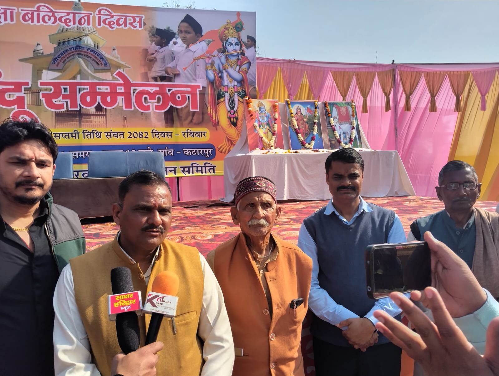 हरिद्वार वरिष्ठ पत्रकार ठाकुर मनोजानंदग्राम कटारपुर में गो रक्षा बलिदान दिवस हिंदू सम्मेलन में सभी उपस्थित अतिथि गणों तथा महानुभावों ने एकजुटता का संदेश देते हुए देश के लिए अपने प्राणों की आहुति देने वाले सभी बलिदानों को श्रद्धा पूर्वक नमन किया तथा अंग्रेजी शासन काल में गाय माता को दी गई फांसी की कथित निंदा करते हुए गाय माता को बलिदान के लिए अपने श्रद्धा सुमन अर्पित किये इस अवसर पर बोलते हुए श्री सुरेश चौहान ने कहा हिंदू एकजुट होकर गौ माता को राष्ट्र माता घोषित करने के लिए संकल्प बध्द होकर सरकार से मांग करते हैं की गाय माता को राष्ट्रमाता का दर्जा दिया जाए उसे संरक्षित किया जाये इस अवसर पर बोलते हुए मास्टर धर्मेंद्र चौहान ने कहा हमारे पूर्वजों और क्षेत्र वासियोंने देश के लिए अभूतपूर्व बलिदान दिया हम उन्हें श्रद्धा पूर्वक नमन करते हैं तथा एकजुट होकर हिंदुत्व की आवाज को बुलंद कर एकता के सूत्र में बंधने का संकल्प लेते हैं हिंदू जाग चुका है अब हमारा अधिकार कोई हमसे नहीं छीन सकता सभी बलिदानियों को हम श्रद्धा पूर्वक नमन करते हैं और उनके बलिदान को हम जायर नहीं जाने देंगे हिंदू जब एकजुट होगा तो देश बुलंदियों के शिखर पर होगा इस अवसर पर मुख्य अतिथि के रूप में पूर्व मुख्यमंत्री हरिद्वार सांसद श्री त्रिवेंद्र सिंह रावत उपस्थित थे उन्होंने कहा जब तक हिंदुत्व एकजुट नहीं हो जाता तब तक हम सुरक्षित नहीं इसलिए हम एकता के सूत्र में बंध कर देश की एकता एवं अखंडता का संपूर्ण विश्व को संदेश देते हैं हमारा देश बड़े-बड़े सूरमाओं का और देवी देवताओं की जननी धरती है हम इस पावन धरती को शत-शत नमन करते हैं और गाय माता को राष्ट्र माता घोषित करने के लिए संकल्प बध्द तरीके से एकजुट होकर गाय माता को राष्ट्र माता घोषित करने के प्रयासरत इस अवसर पर श्री वरुण चौहान नीतीश चौधरी डॉक्टर श्याम सिंह आर्य जितेंद्र सिंह तोमर योगेश चौहान पंकज सैनी रवीश गोदियाल बुद्धि महा प्रताप तीरथ सिंह सैनी वेद प्रकाश सैनी रजनीश चौहान जिला मीडिया प्रभारी भाजपा श्री धर्मेंद्र चौहान सहित भारी संख्या में क्षेत्रवासी तथा विशिष्ट जन उपस्थित थे