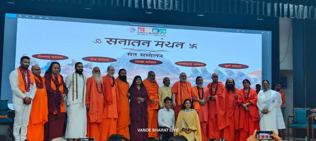 कोर यूनिवर्सिटी में आयोजित “सनातन मंथन” के संत सम्मेलन की अध्यक्षता निरंजनी अखाड़े के महासचिव महामंडलेश्वर रामरतन गिरी महाराज व संचालन वेद वर्धन कवि ने किया।